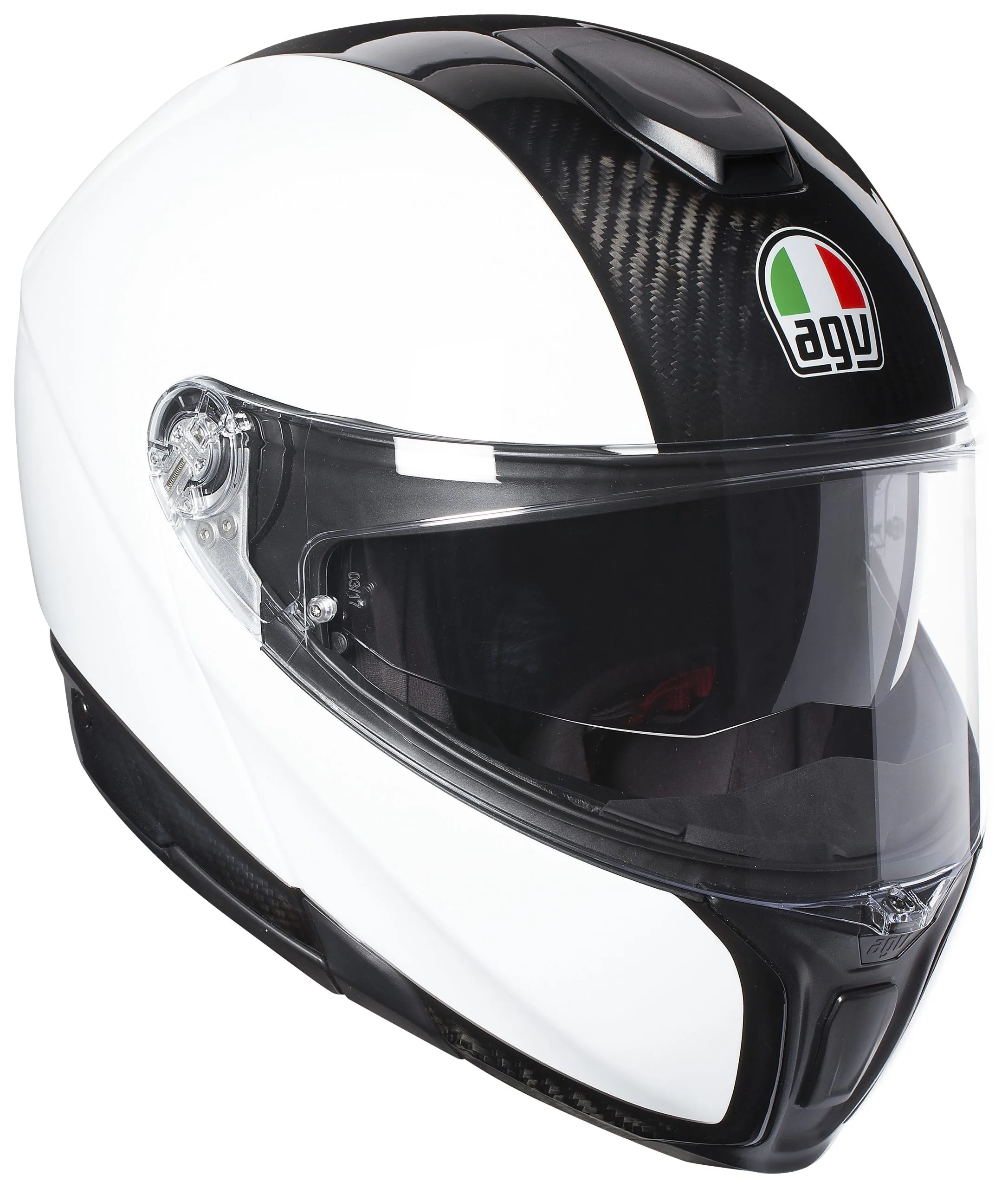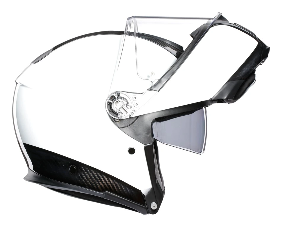 Modular helmet wearers, rejoice! The AGV Sportmodular Carbon Helmet is here and ready to lay down those miles with you. Built with the AGV Pista GP R in mind, the Sportmodular has the same protection and lightweight construction. The helmet liner is two-sided and reversible, so you can pick the best level of comfort depending on the weather. The GT3 face shield is prepared for the Pinlock 120 insert lens, which is race-level anti-fogging at your fingertips. Metal hardware at the chin bar closes the bar securely. Swap out the face shield effortlessly with no tool required.