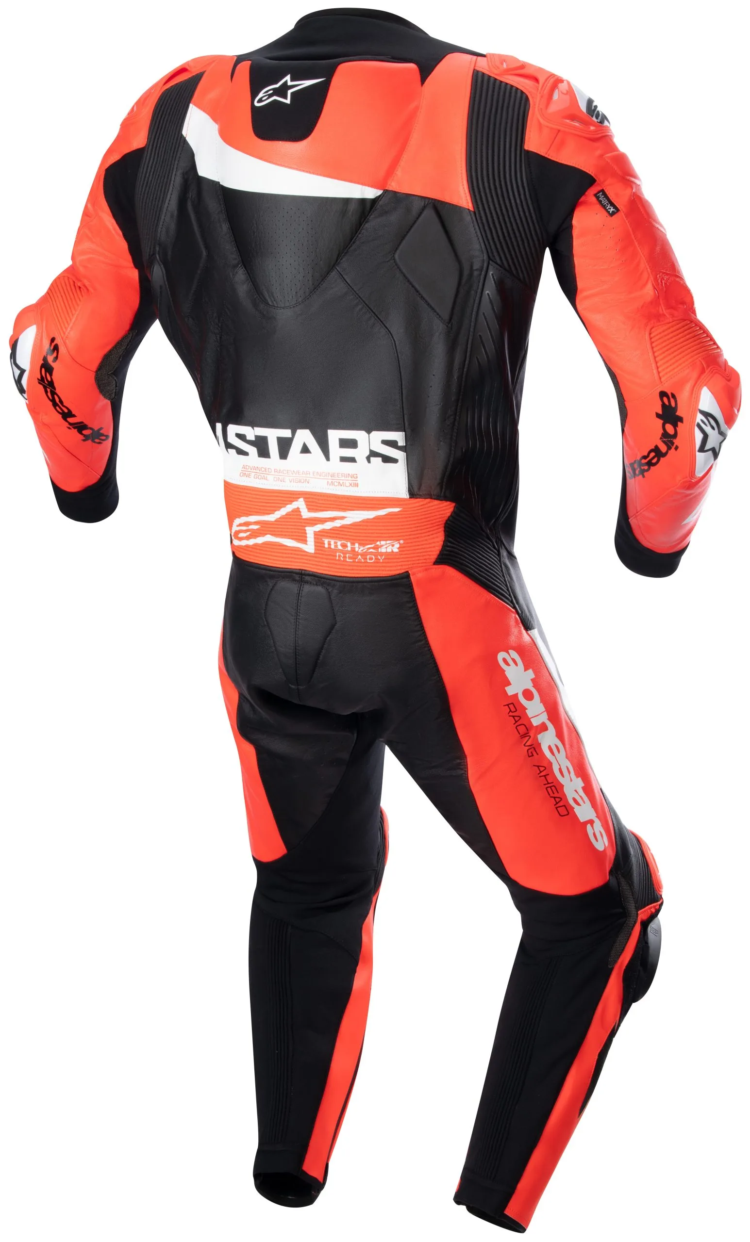 The GP Plus v4 Race Suit from Alpinestars is a one-piece suit with a multitude of features. Hard TPU external elbow, shoulder and knee sliders are backed by CE-rated protection. The tough perforated cowhide construction is made comfortable with soft, rolled edges at the collar and cuffs. Generous panels of stretch fabric and accordion leather create a comfortable fit while, reflective accents and adjustable lower leg keep you prepared for any track situation. The GP Plus v4 is also ready for Tech Air 5 and Tech Air 10 Airbag systems.