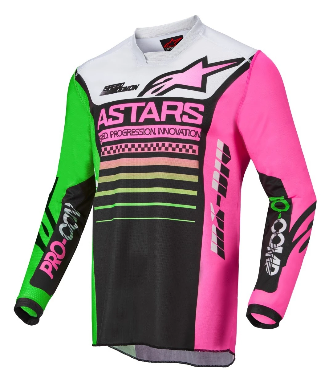 Featuring an evolved pattern design for improved fit and comfort, Alpinestars Racer Jersey is lightweight and highly moisture-wicking. Cut longer in the rear for compatibility with Alpinestars MX pants, the Racer Jersey comes in a range of distinctive and aggressive color combinations and is designed to match the Racer Pants for a total performance look and feel.