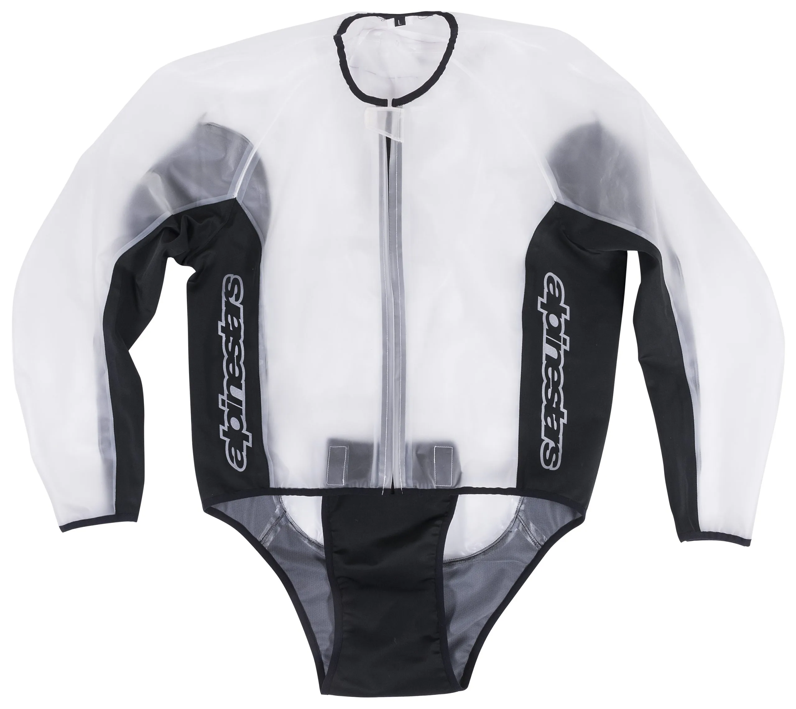 Be prepared. Donât let inclement weather ruin your next track day â or your leathers. The Alpinestars Racing Rain Jacket is a pro-level garment specifically designed to fit over and protect the top half of your leather race suit for racing in wet conditions. Ultra-lightweight 2mm material is 100% waterproof to keep you dry and transparent to keep the sponsors happy. PU coated stretch allows a measure of flexibility so you can stay focused on walking that razor-thin line between breaking her too far loose and winning.