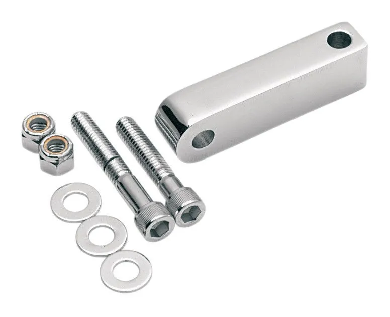 The easy way to relocate your headlight about 2 1/4″ forward. Sure, you could machine and drill a steel block and have it chromed – but who wants hours tied up in a headlight mount? For bottom triple tree mount only.