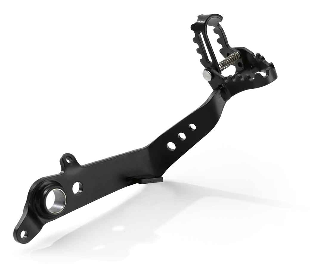 Dial in the controls of your adventure machine with this adventure ready brake pedal. It is machined from lightweight aluminum with a tough powder-coated finish. It features a flip down toe peg that raises the control surface to allow the rider to more easily control the rear brake while standing up.