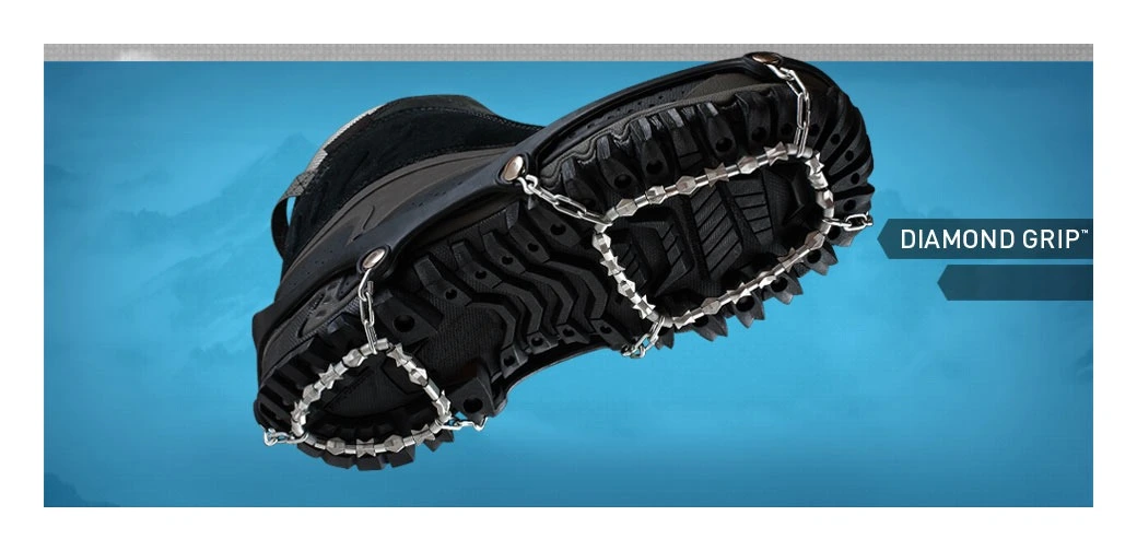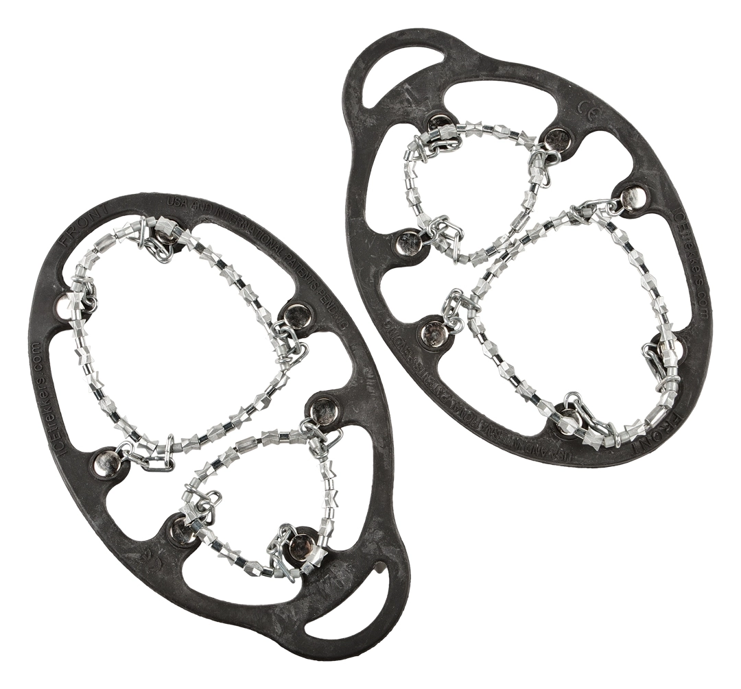Icetrekkers Diamond Grips provide aggressive traction for all winter walking conditions, from ice to snow and everything in between. They are also effective when transitioning through gravel, rock and mud from icy surfaces. Made of case hardened steel alloy and strung on steel aircraft cable, the Diamond Beads have hundreds of biting edges that grip in all directions. The bead assemblies are riveted to a tough rubber sling which remains elastic in subzero temperatures. They are easy to put on and take off, yet fit snugly and stay on without the need for additional straps. Icetrekkers Diamond Grips are also self clearing, so there is no snow or ice build up.