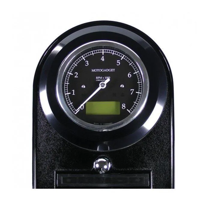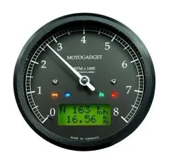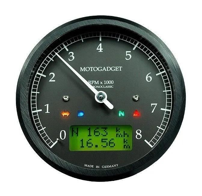 The Motogadget Chronoclassic is a digital multi-purpose instrument in a classic round casing.