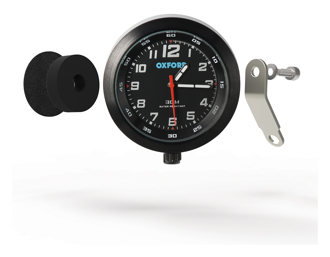 The Oxford Clock is a high specification analogue clock designed and tested to endure vibration, heat and extreme weathers specifically for use on a motorcycle. Constructed from tough alloy and stainless steel with a hardened mineral glass fascia protecting the Swiss Newlite luminous clock hands for better night-time visibilty, the Oxford Clock has passed a 250 hour salt spray test to achieve the ASTM B117 standard and is water resistant to 3 ATM or 98′ (30m).