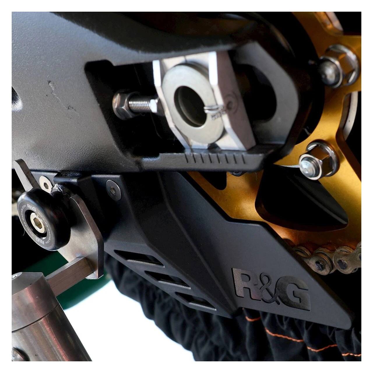 The R&G Chain and Sprocket Guard was developed in conjunction with road race hero Ryan Farquhar. Made from lightweight materials, this guard features an oversized fin that ensures adequate coverage of the sprocket.
