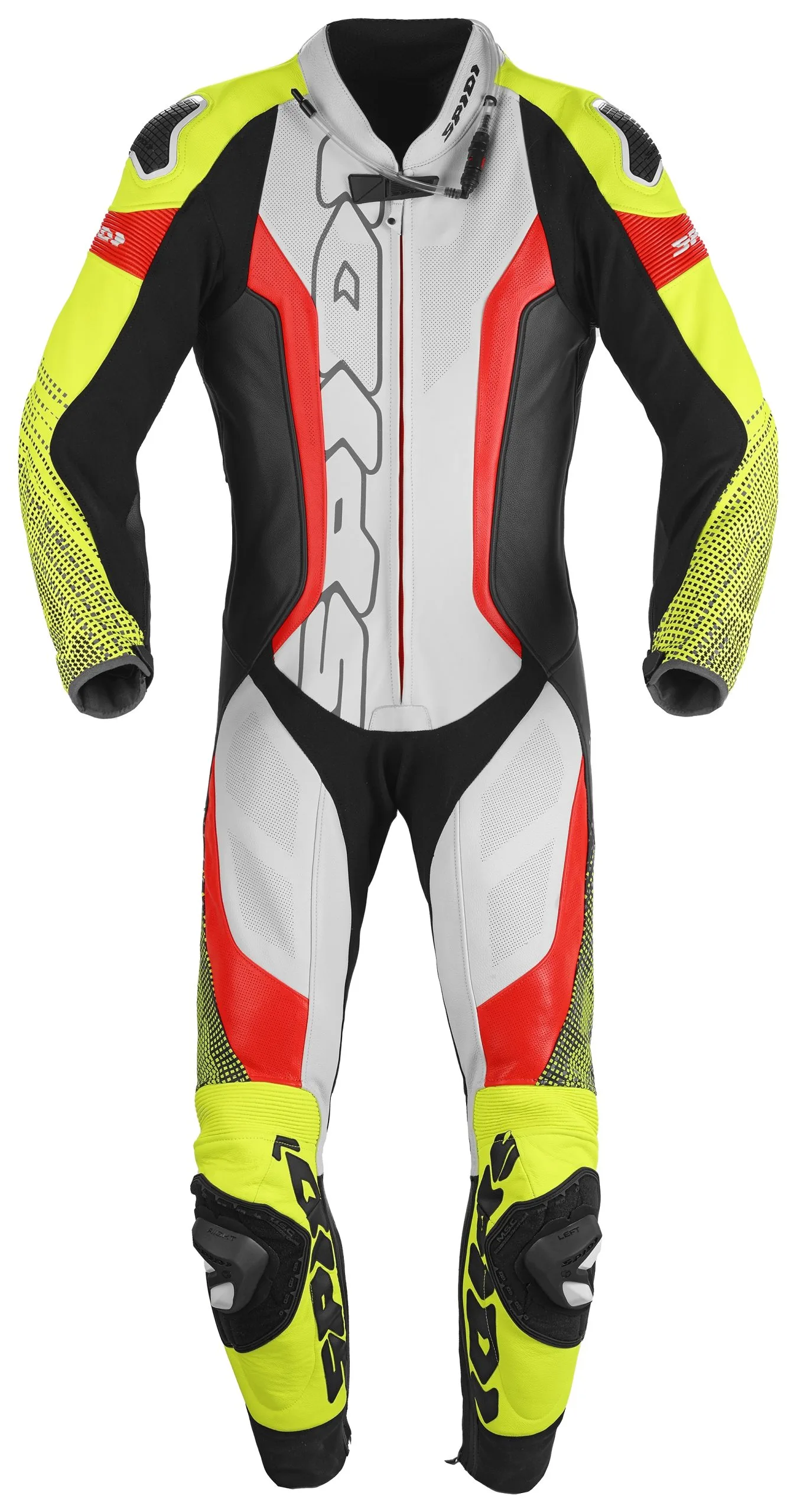 The Supersonic Pro is the latest addition in Spidi’s collection of track-focused race suits. Ushering in an unprecedented level of comfort and toughness, construction begins with 1.1-1.3mm Italian cowhide. Large, unbroken panels of leather are then joined with high-tenacity nylon stretch panels. CE Level 1 armor for shoulders, elbows, hips and knees is included, and the suit will accept Spidi’s Warrior style chest and back protectors (sold separately). Mobility at the impact zones is achieved with accordion leather flex panels, as found at the upper knees and shoulders. Localized perforation and arrangements for an optional hydration bladder and straw help you keep your cool. A removable mesh liner makes upkeep on the Supersonic Pro Suit a breeze.