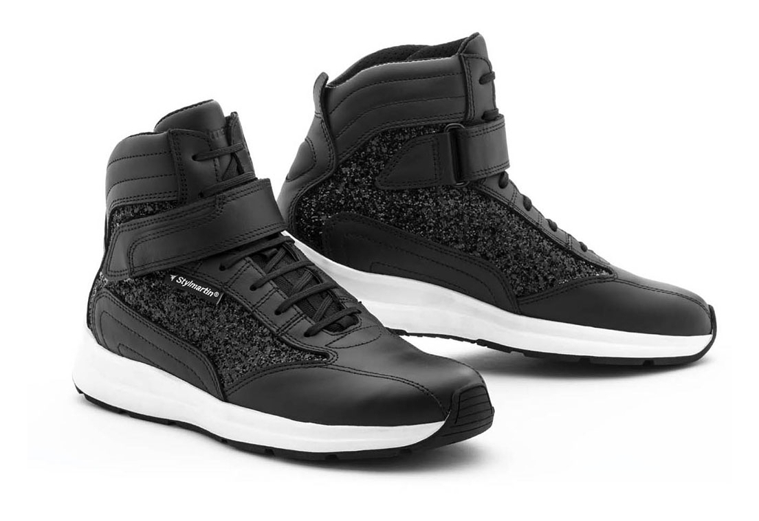 The Stylmartin Audax Riding Shoes are the high tops for the sneakerhead motorcyclist. A leather suede and fabric upper give the appearance of an old school high top, while waterproofing and and a stiff sole provide protection for the road. Two sets of laces let you configure your shoe as you prefer. Side panels are accented with glitter – adding an extra bit of attitude and even some low light visibility.