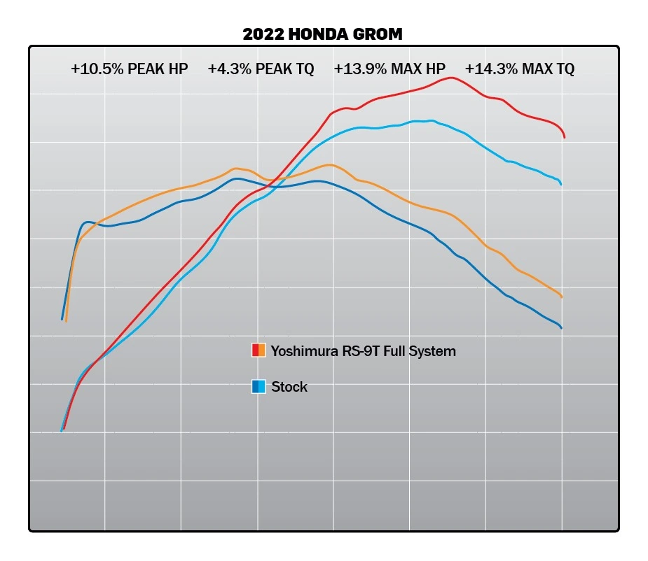 Yoshimura was very excited about the US release of the Grom back in 2013, and with the new refresh for the third gen Grom, Yoshimura’s R&D team anxiously waited to get their hands on one to develop this RS-9T Full Exhaust system for the market. Yoshimura has been working tirelessly on the development of the RS-9T (Tapered) Exhaust with American Honda HRC’s engineers to achieve maximum performance and mass centralization, to optimize rider usability. Working with Honda R&D in Japan, Yoshimura was able to deliver an exhaust that provides more tractable power with improved torque which in turn leads to better handling and performance.